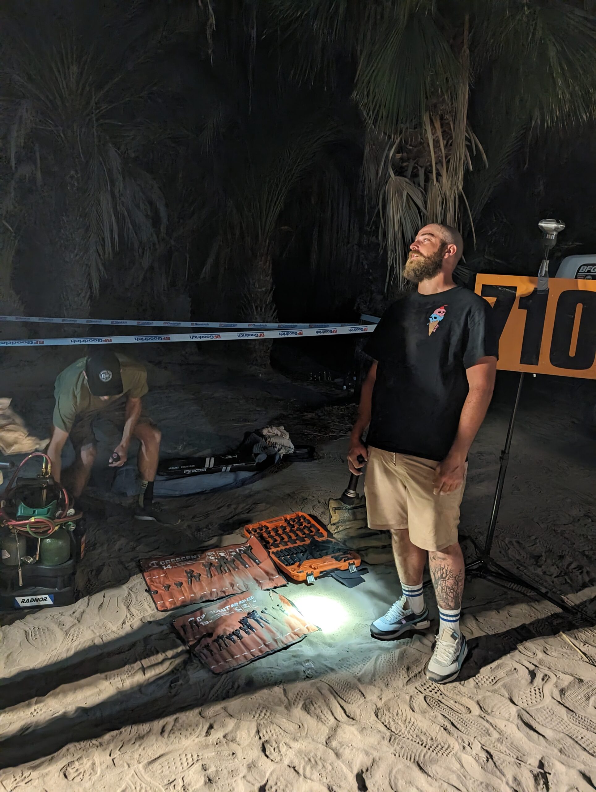 This final leg of Justin and Berne’s section was a fast one for them, and a slow one for the highway, so I needed to hustle to try and reach the driver change before they did. Spoiler, I didn’t make it, but just by a little bit. The driver change was in a town that feels like a ghost town. El Arco is desolate, and creepy. Think scary movie landscape with an abandoned playground, scary church and that one weird tree. Our pit was behind some of the buildings. With all the big lights cutting through the night, the town looked even more scary movie abandoned. After a bit of a rest and some coffee, we packed up another pit, added more trucks to our convoy and got back on the road. It’s always a big relief when everyone gets out of the car safely. Two driver changes down, one more to go.